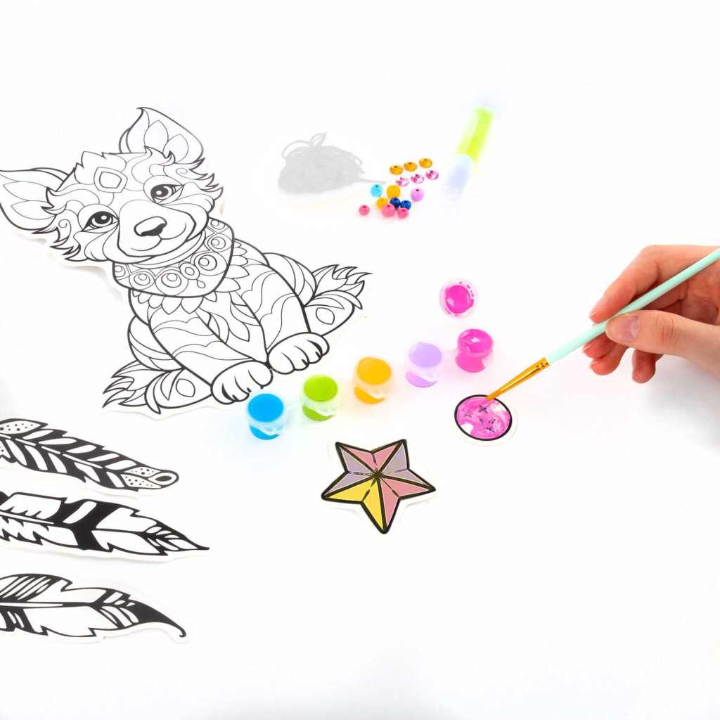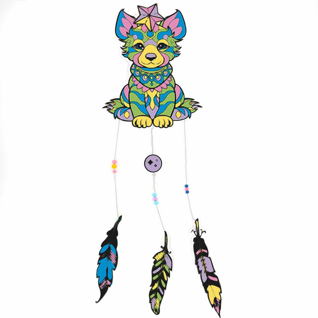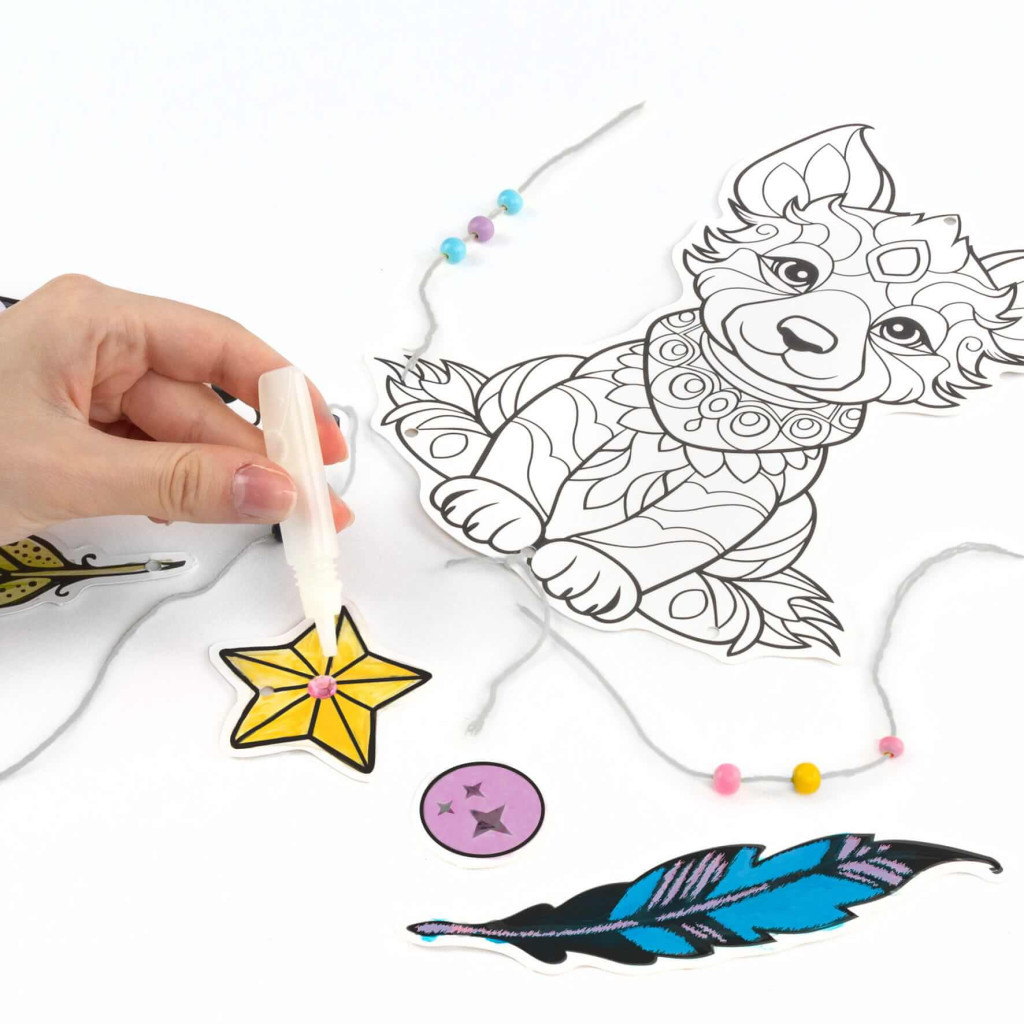Álomfogó készítő szett, foszforeszkáló, kutya, Kidea Sötétben világító álomfogót készíthetsz a készlet segítségével! A készlet tartalmaz karton formákat, festéket, ecsetet, zsinórt, gyöngyöket, strasszkövet és ragasztót is. Csomagolás mérete: 18x26cm