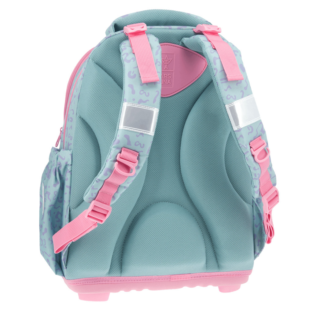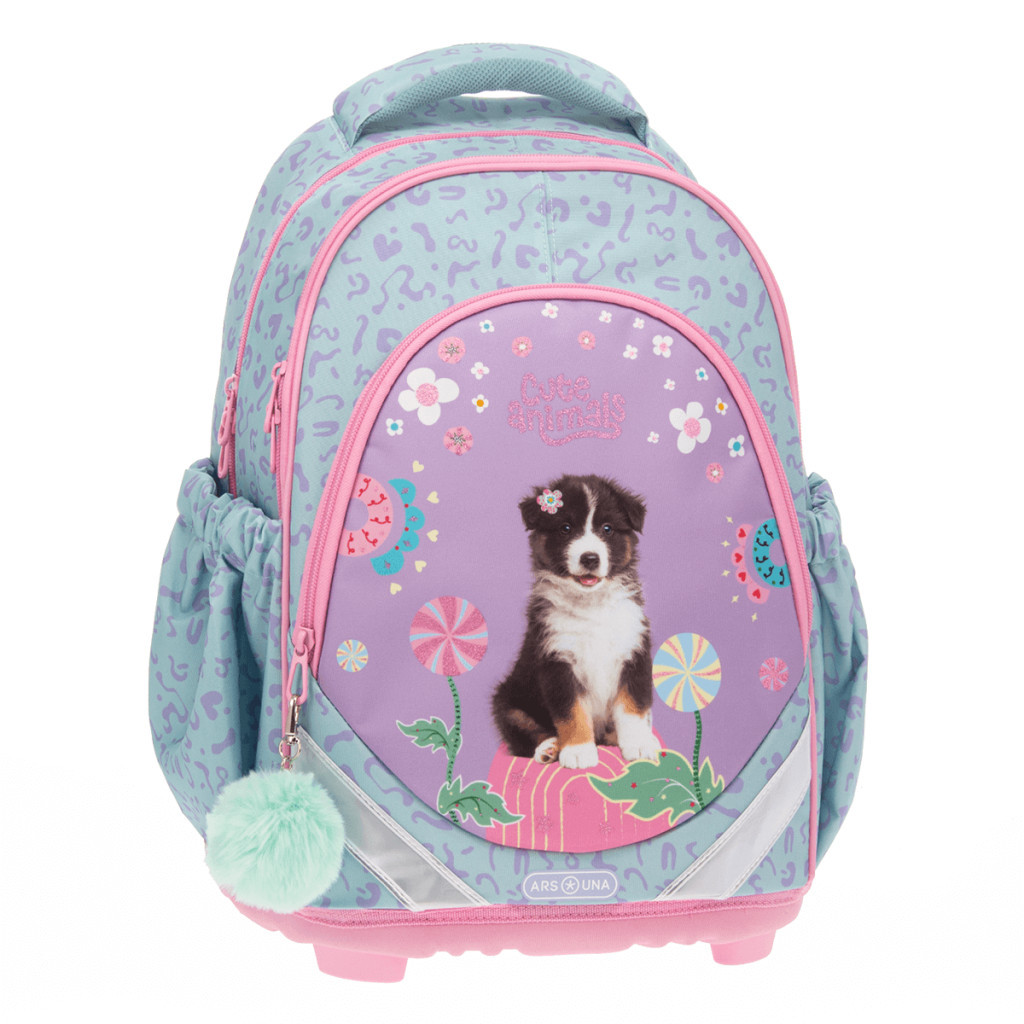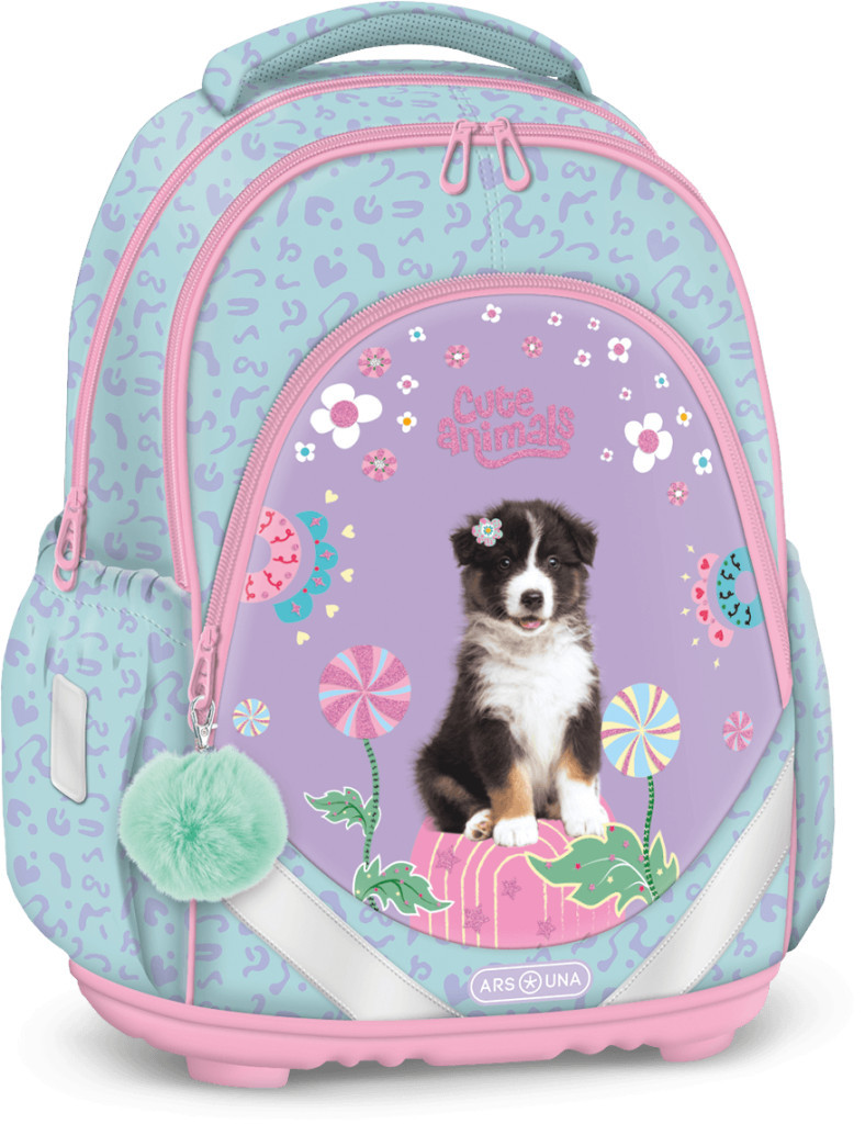 Aussie, kutyás anatómiai iskolatáska, hátizsák, 43x33x22cm, Ars Una,CUTE Ars Una, Aussie, kutyás. Hátizsák formájú iskolatáska, amely ideális kisiskolásoknak. Ergonómikus kialakítású, szellőztető barázdákkal teli és műanyag merevítésű hátkiképzéssel. Puha, méretre állítható vállpántokkal, amelyekekkel szabályozható, hogy mennyire álljon feszesen a gyerek hátához simulva a táska. A hátizsák három nagy cipzáras rekesszel rendelkezik,az elsőben toll- és igazolvány tartó rekesz található. Oldalán két gumis zsebbel a kulacs részére. Alja tartós és kemény textillel bevont műanyag. Nagy felületű fényvisszaverő elemekkel elől, oldalt és a vállpántokon. Tetején fogantyúval. Ajándék pompom a táskához. Mérete: 430x330x220 mm. Súlya: 0,9 kg. Táska űrtartalma: 23 l. Terhelhetőség: 10 kg-ig. 3 év garancia.