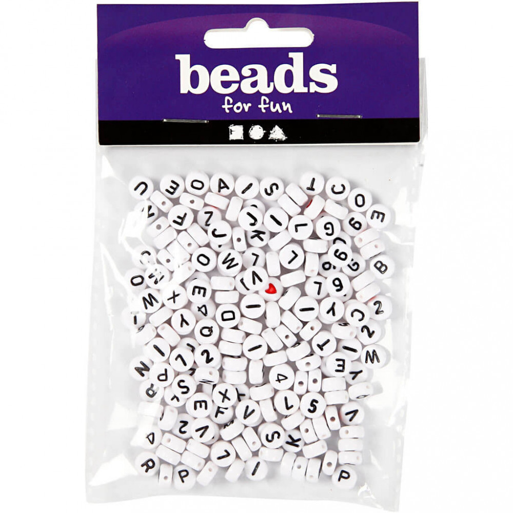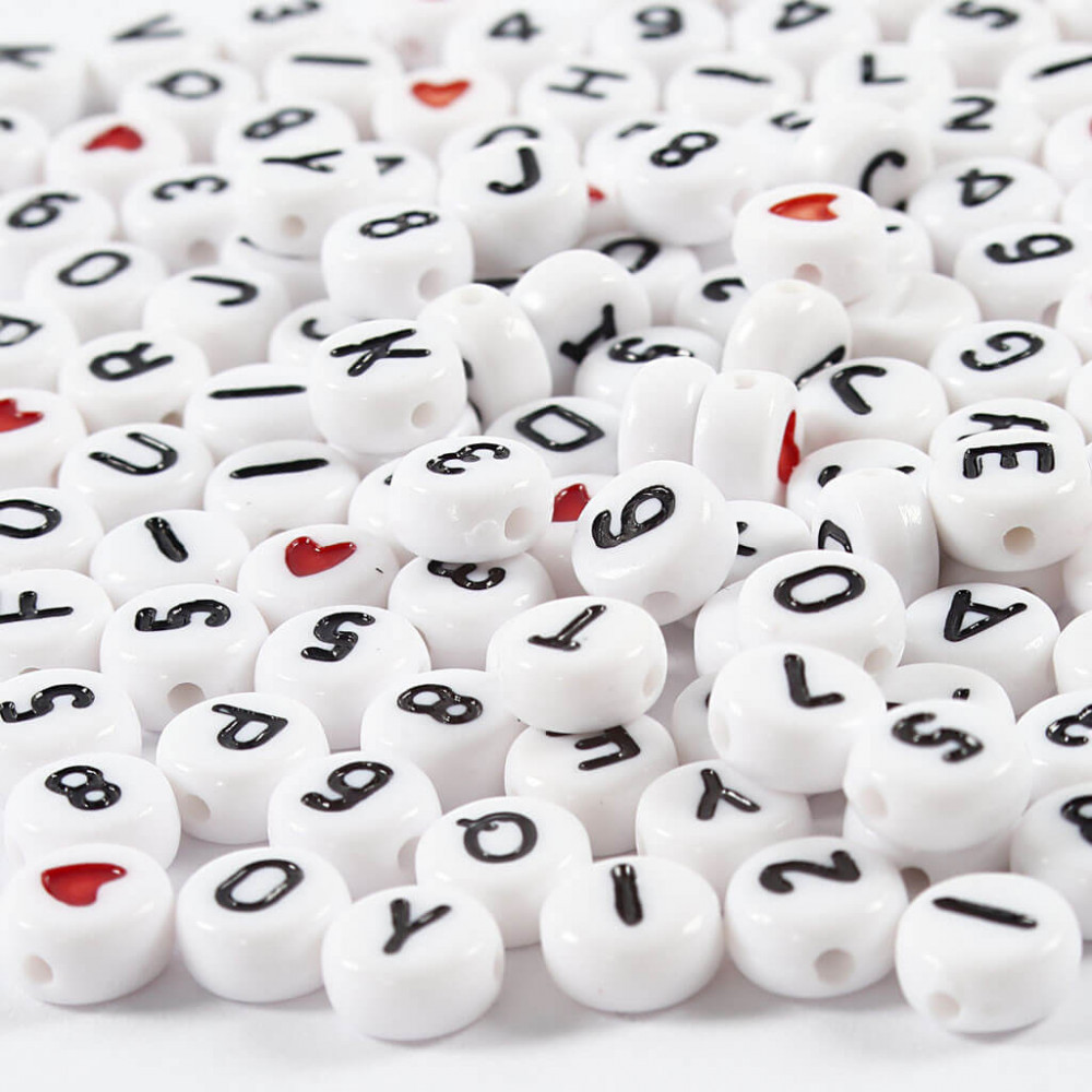 Betű gyöngyök, kerek, fehér gyöngy fekete betűkkel, kb. 200 db/csomag. 7mm-es. Vegyesen betűk, számok, szív.