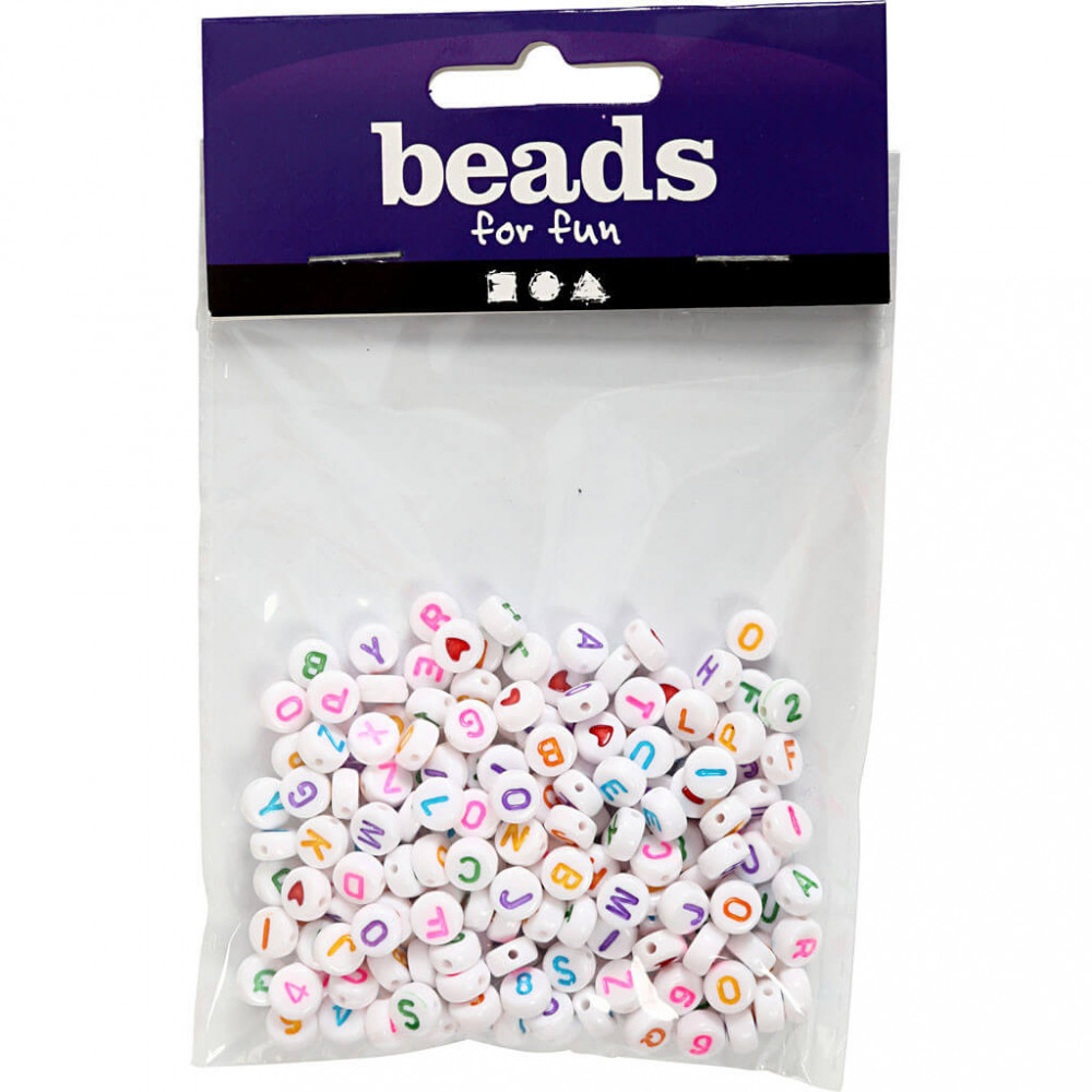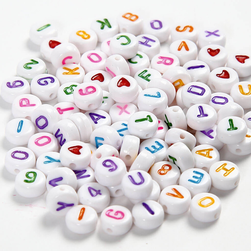 Betű gyöngyök, kerek, fehér gyöngy színes betűkkel, kb. 200 db/csomag. 7mm-es. Vegyesen betűk, számok, szív.