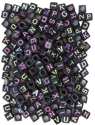 Betű gyöngyök, fekete kocka neon színű betűkkel.