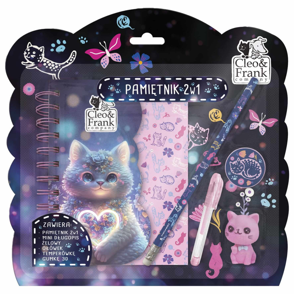 Cleo and Frank napló írószerekkel, CF43, cicás, kék. A készlet tartalmaz egy naplót, radírt, ceruzát, mini tollat és egy hegyezőt.