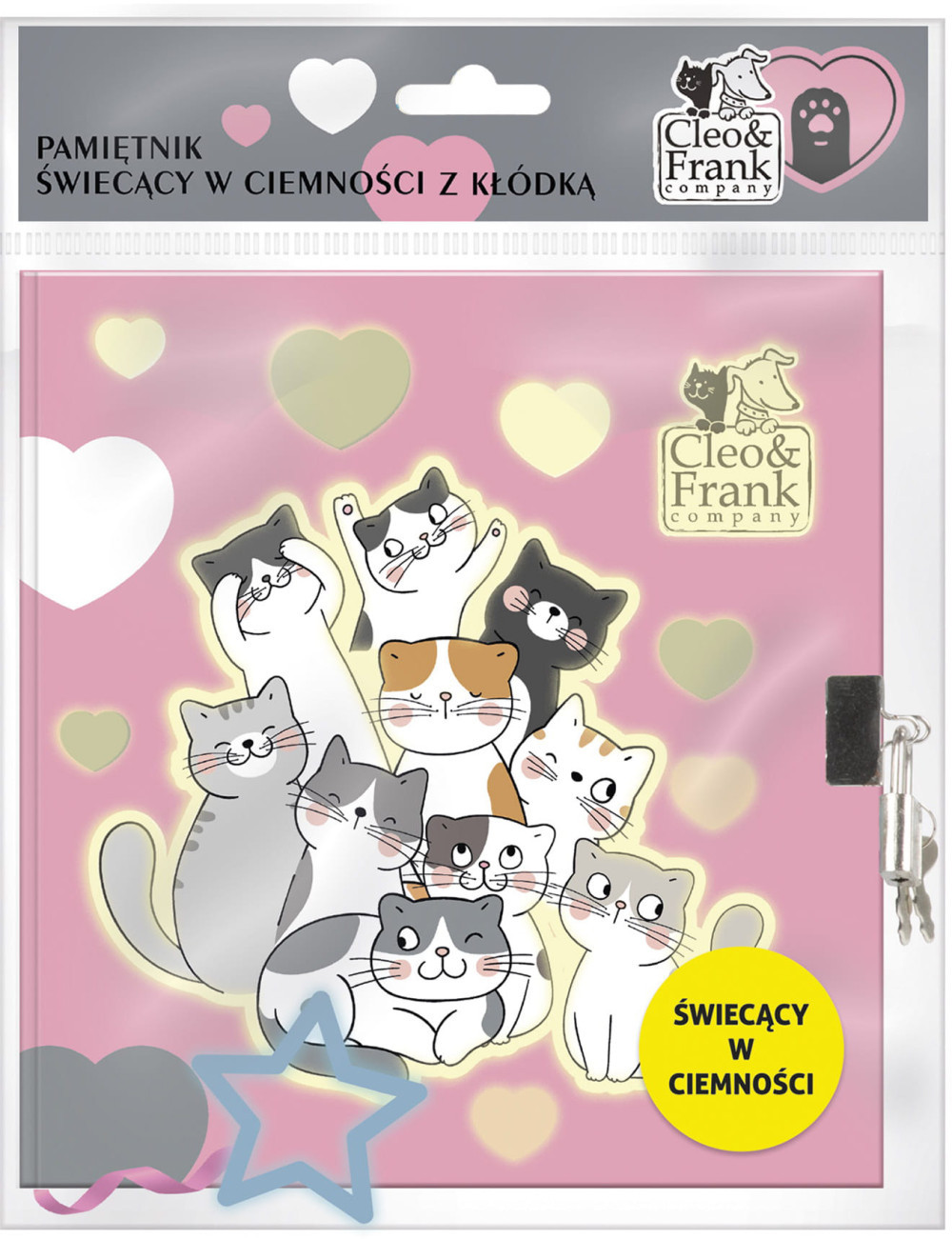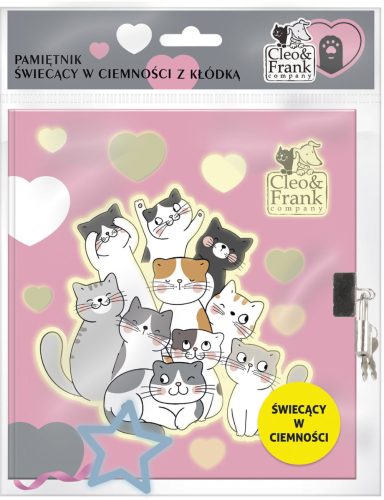 Cleo and Frank napló kulccsal, 17x15cm, foszforeszkáló mintákkal, CF39, cicás, rózsaszín