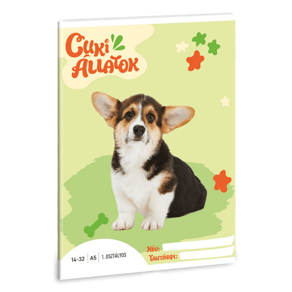 Cuki állatok tűzött füzet A/5, 32 lap vonalas 1.osztály (14-32), welsh corgi. Mérete: A/5, 147x205 mm Lapok száma: 32. Lekerekített sarkokkal. Borító: 250 gr-os műnyomó. Belső: 75 gr-os papír. 1. osztályos szabvány szerinti (14-32-es) vonalazással, margózott oldalakkal.