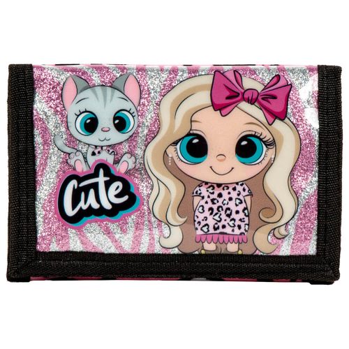 Cute pénztárca, 12x8cm, BF10, kislány cicával. Többrekeszes pénztárca, amely használható suliba, kirándulásra, stb.