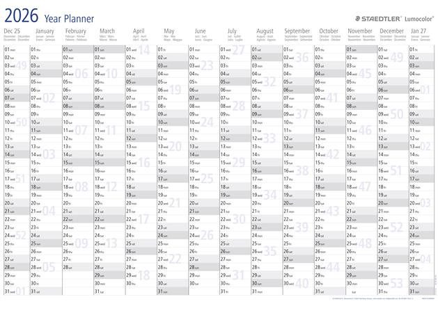Éves tervezőtábla, törölhető, angol nyelvű, 84x60 cm, STAEDTLER "Lumocolor® 641 YP", 2026