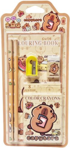 Kapibara írószer, suli szett, 6 db-os, 11x23cm. A szett tartalmaz egy színező füzetet, egy doboz zsírkrétát, egy hegyezőt, egy radírt és 2 db grafitceruzát.