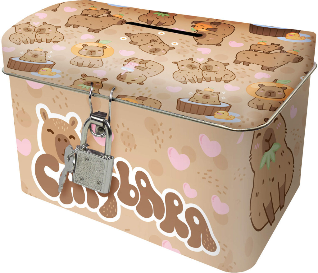 Kapibara persely, szögletes, KB10. Fém persely lakattal és kulccsal. Méret: 12x8x8cm.