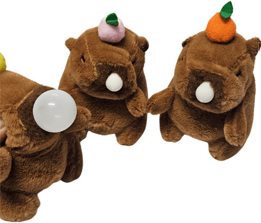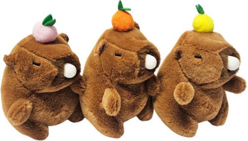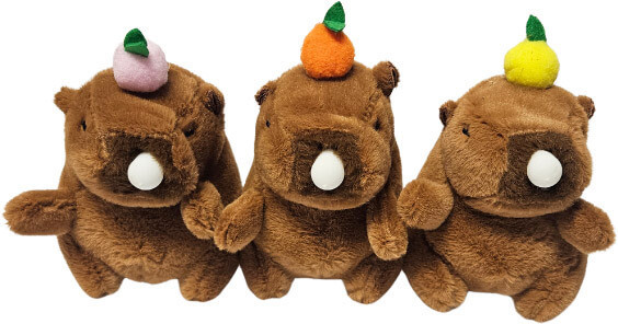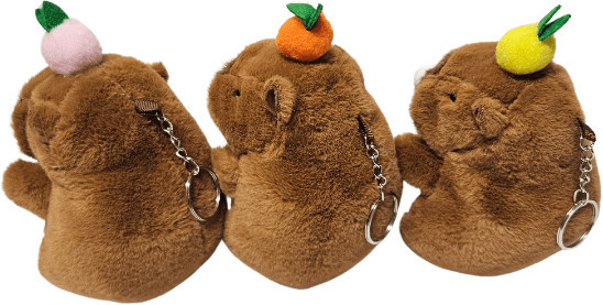 Kapibara plüss kulcstartó, rágógumis, gyümölccsel a fején, kb. 12 cm. A kapibara szájából egy mini lufi lóg ki. Ha a kapibara fejét nyomogatjuk, akkor a lufi felfújódik, mintha rágógumit fújna. Többféle változat, nem biztos, hogy mindegyik van készleten.