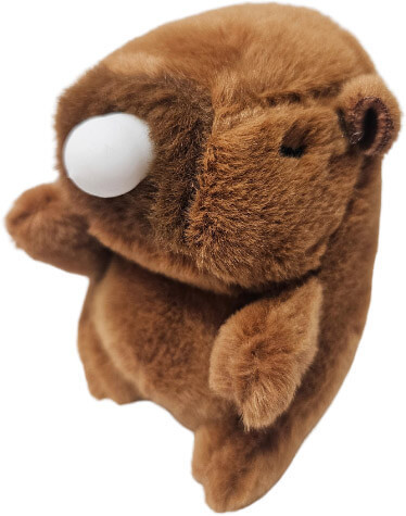 Kapibara plüss kulcstartó, rágógumis, kb. 12 cm. A kapibara szájából egy mini lufi lóg ki. Ha a kapibara fejét nyomogatjuk, akkor a lufi felfújódik, mintha rágógumit fújna.