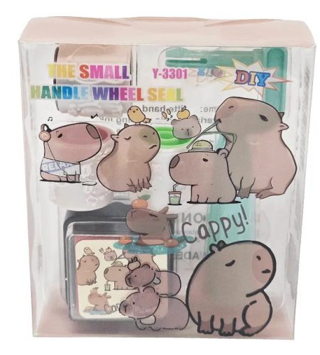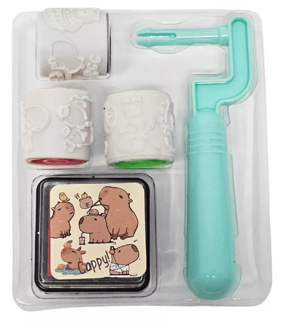 Kapibara rolleres nyomdakészlet tintapárnával. A készlet tartalmaz 3 különböző mintájú nyomdázó rollert és egy mini tintapárnát. A csomagolás mérete: 7,5x9x3cm