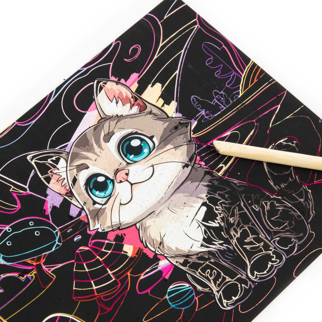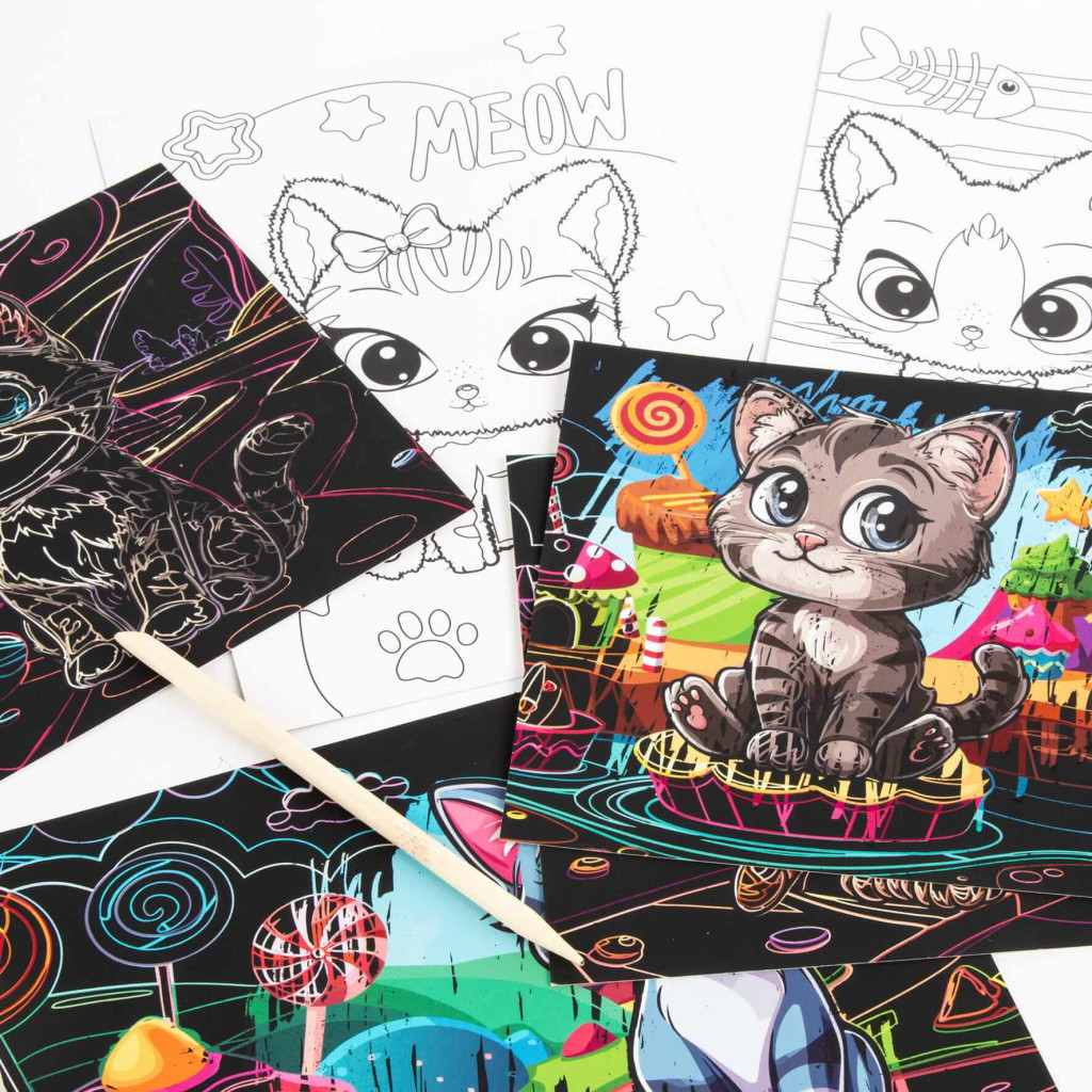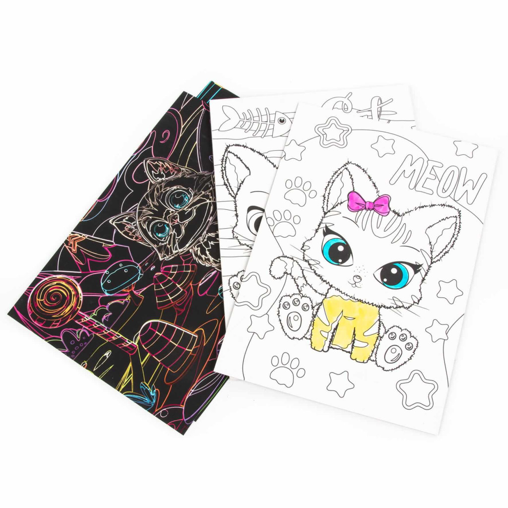 Képkarcoló füzet színezővel, cicás, Kidea A készlet tartalmaz 6 db lapot, amelynek az egyik oldalán karcolható kép, a másik oldalán pedig színező található. Ez a készlet tökéletes unaloműző, órákig elszórakoztat Méretek: 18 x 26 cm