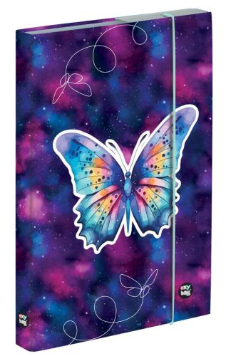 Lepkés füzetbox A/5, OXY Butterfly. Méret: 168x230x30 mm, Súly: 169 g Népszerű füzetdoboz A5-ös formátumban. Minden iskolás gyermek felszerelésének elengedhetetlen része füzetek, papírok és egyéb iskolai kellékek tárolására. Tartós anyag - laminált, véd a sérülésektől. Rugalmas záródás. Gerinc szélessége 3 cm.