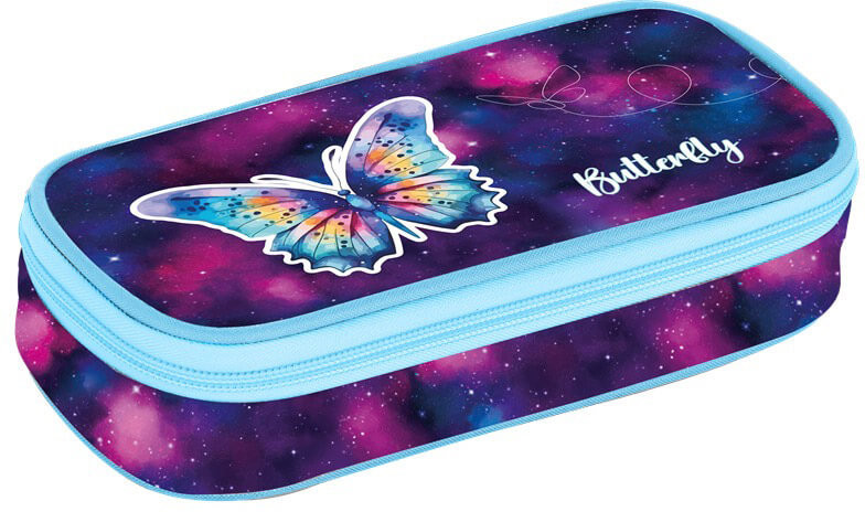 Lepkés tolltartó, beledobálós, jumbo, OXY 2026 Butterly. Méret: 235x130x60mm. Belül cipzáras zseb és gumis ceruzatartó fül is található.