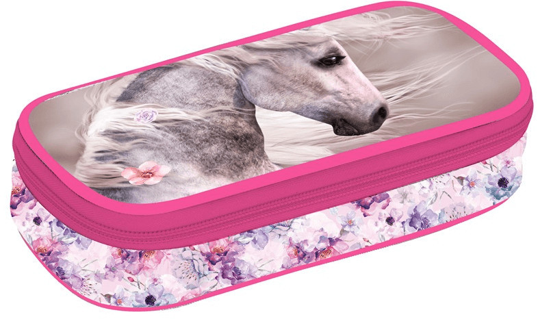 Lovas tolltartó, beledobálós, Horse Romantic, fehér ló. Méret: 205x100x50mm. Belül cipzáras zseb és gumis ceruzatartó fül is található.