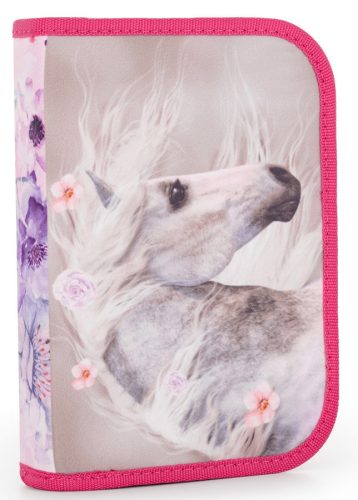 Lovas tolltartó klapnis, üres, Horse Romantic, fehér ló. Méret: 14x20,5x3,5cm. Üres tolltartó, 25 gumis hellyel.