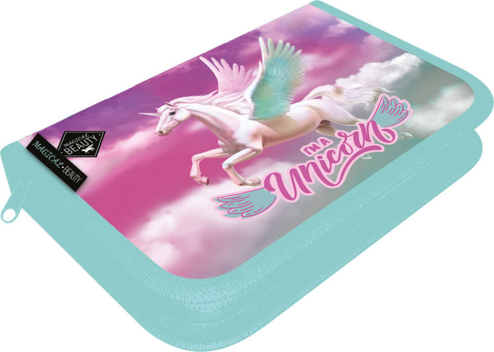 Magical Beauty tolltartó, klapnis, üres, 19x13x4cm, Magic, unikornis. Varrott, textil tolltartó, erős cipzárral, két kihajthatófüllel, töltés nélkül. 27 + 3 gumis bújtató az írószerek és egyéb kiegészítők számára, 2 műanyag zseb, órarend.