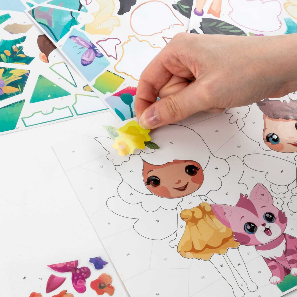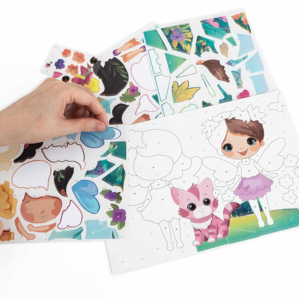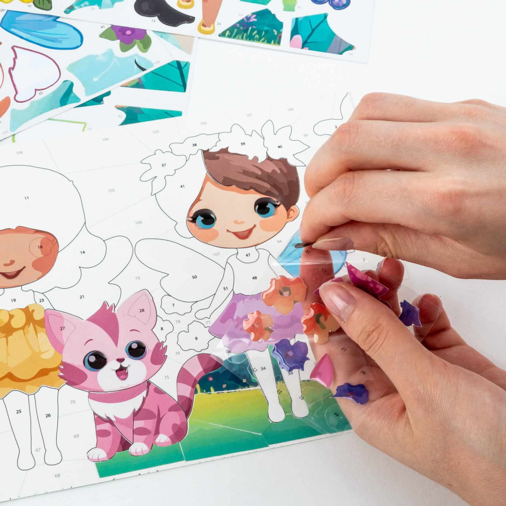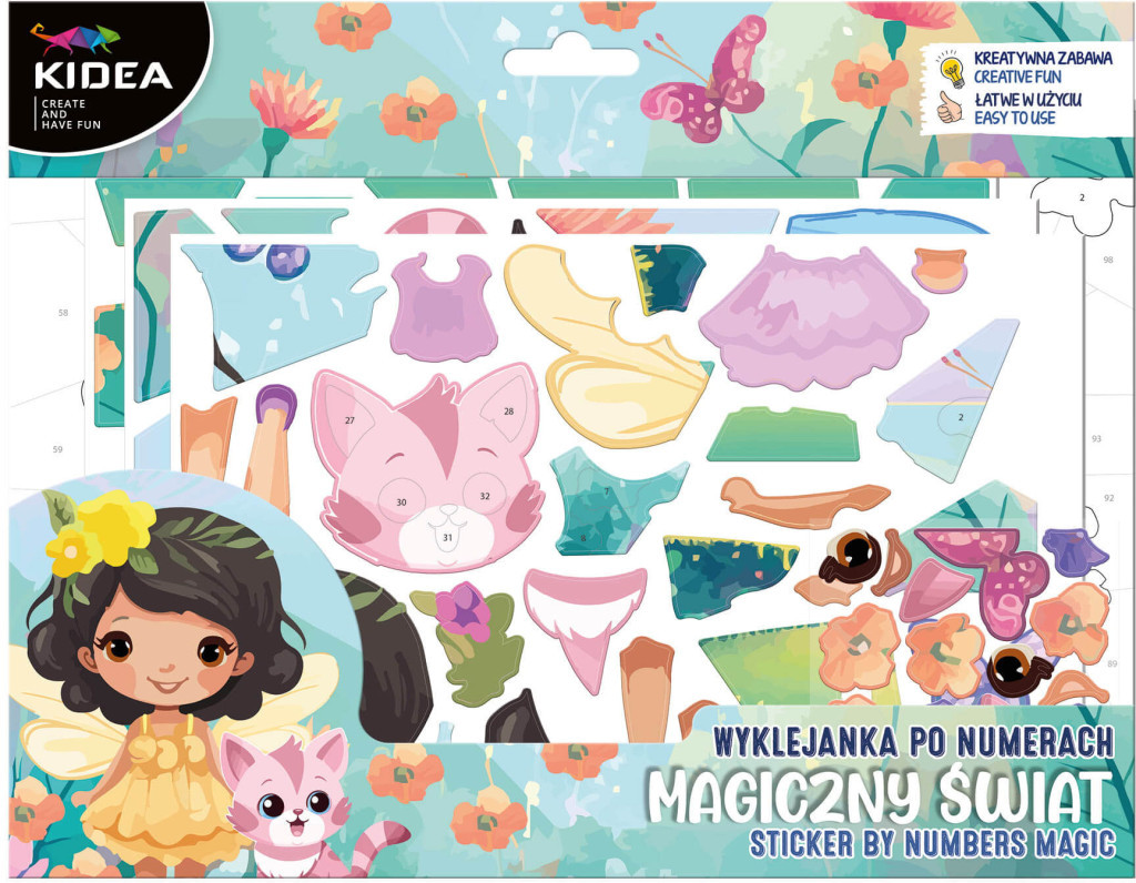 Matricázz számok szerint, Kidea, kislány cicával Alkoss gyöngyörű képeket festék és ecset nélkül. A lapon számozott helyek vannak, amelyeket a mellékelt matricákkal tölthetsz ki. Mindenhol szám jelzi, hogy hova melyik matricát kell ragasztani. Ez a tevékenység fejleszti a koncentrációt és a precizitást, miközben a környezeted tiszta marad, így utazáshoz is kiváló. A készlet 1 számozott lapot és 4 lapon több, mint 100 színes matricát tartalmaz. Méret: 27x20cm