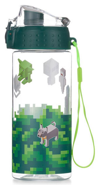 Minecraft mintás kulacs, 500ml, BPA mentes, OXY Click 2026 Playworld. Méret: 70*70*190 mm, Súly: 114 g Gyermek ivópalack kiváló minőségű és biztonságos Tritan anyagból. A palack tesztelt, nem tartalmaz BPA-t vagy ftalátokat. A palack teteje zárral és nyitópatenttel van ellátva, amely a gomb helyzetének változtatásával működik (fel = zárva, le = nyitott). Ennek köszönhetően a palack könnyen nyitható, és egyúttal védett a véletlen kiömléstől. A palack űrtartalma 500 ml, mosogatógépben mosható maximum 80 °C-on, és 5 éves kortól ideális gyermekek számára. A praktikus zsinór megkönnyíti a kezelést, az ivópohár átmérője pedig 2,5 cm. Figyelmeztetés: A palack nem szénsavas italokhoz készült.