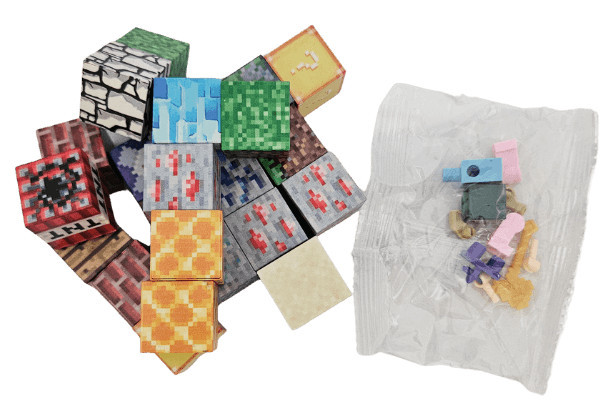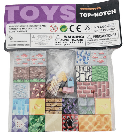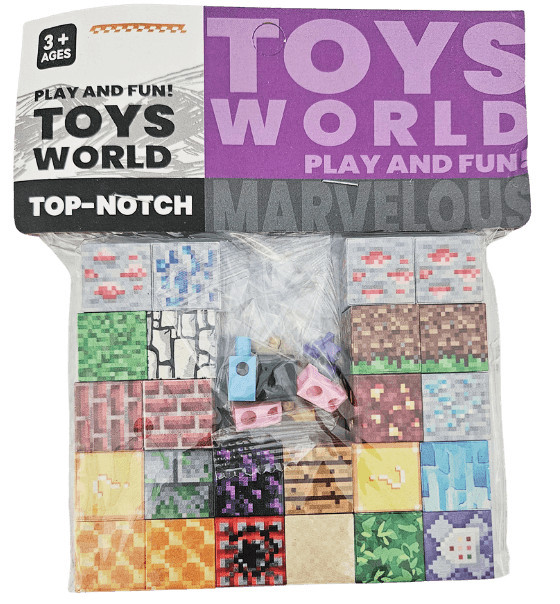 Minecraft mintás mágneses kockák (24 db) és egy összerakható minifigura található egy 10x12cm-es csomagban.