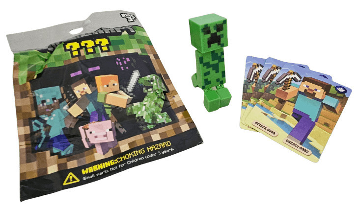 Minecraft zsákbamacska figura tasakban kártyákkal. Az ár egy tasakra vonatkozik, amely egy darab zsákbamacska figurát és kártyákat tartalmaz.