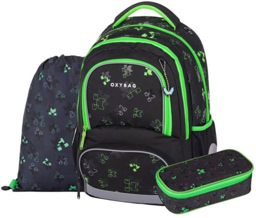 OXY Next iskolatáska szett, hátizsák tolltartóval és tornazsákkal, Green cube, Minecraft mintás