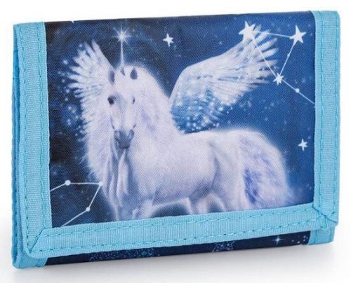 Pegazus pénztárca, 10x14cm, kék. Méret: 140x105x20mm. Cipzáros rekesszel az aprópénznek, egy nagyobb rekesz a bankjegyeknek, 6 zseb a kártyáknak.