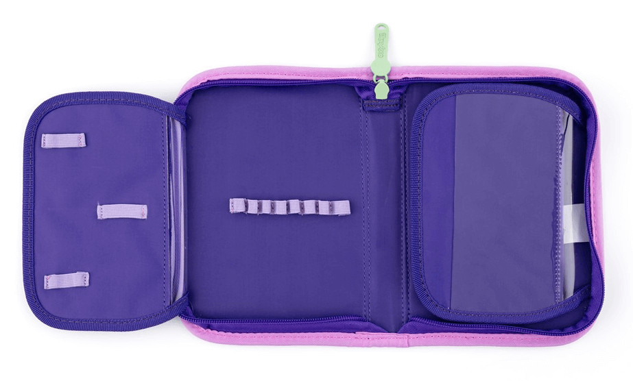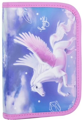 Pegazus tolltartó klapnis, üres, lila-rózsaszín. Méret: 14x20,5x3,5cm. Üres tolltartó, 25 gumis hellyel.