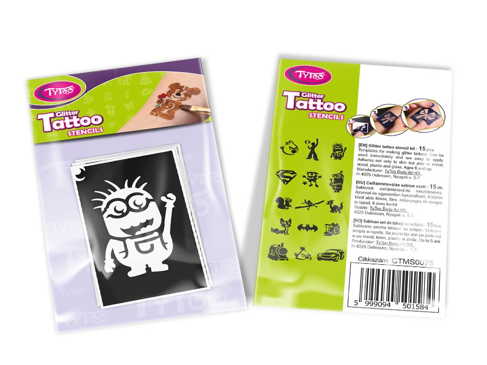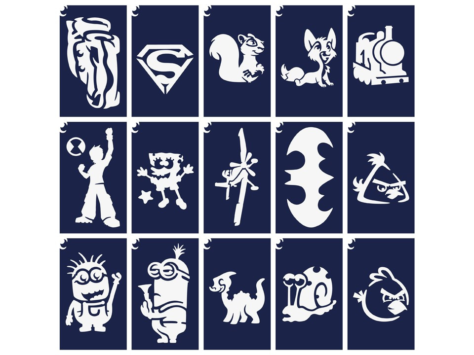 A csomagban található sablonok segítségével fiús csillámtetoválás mintákat készíthetsz, melyeket egyéb testfestéshez is felhasználhatsz.