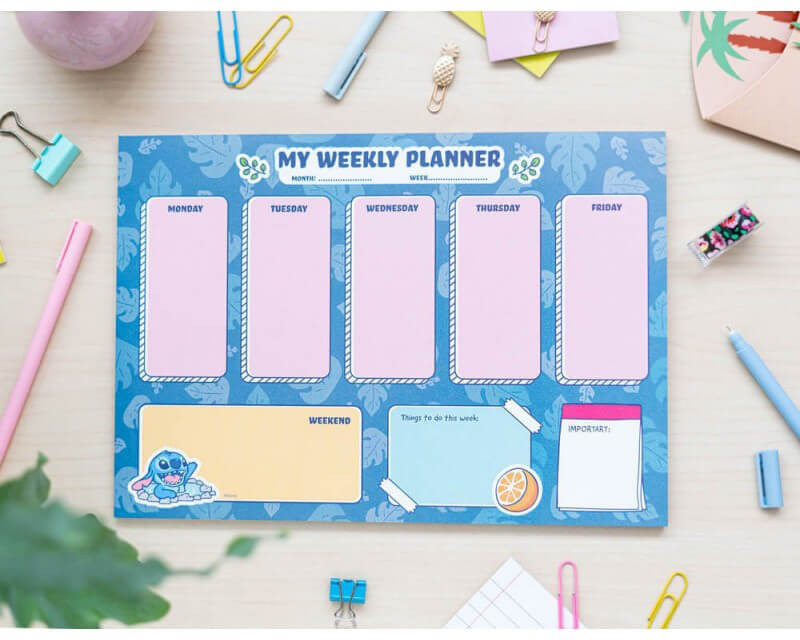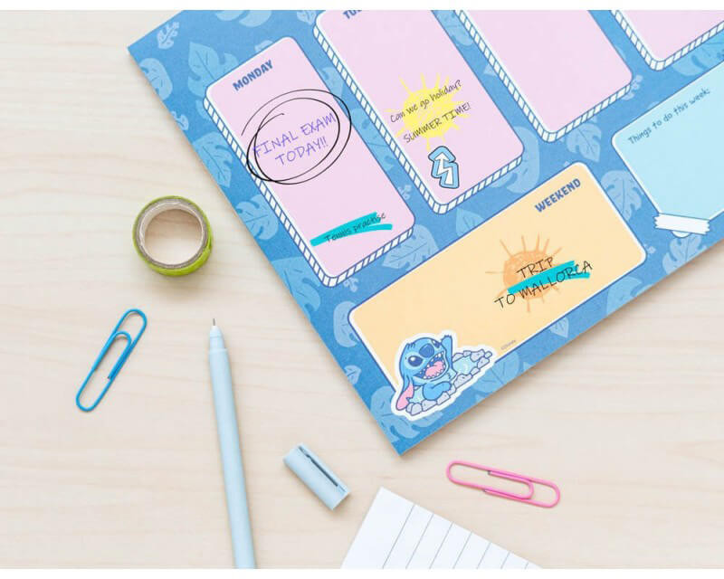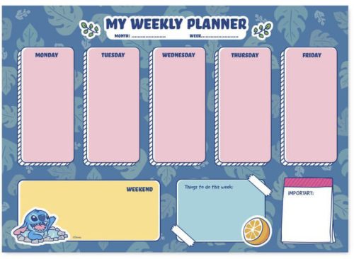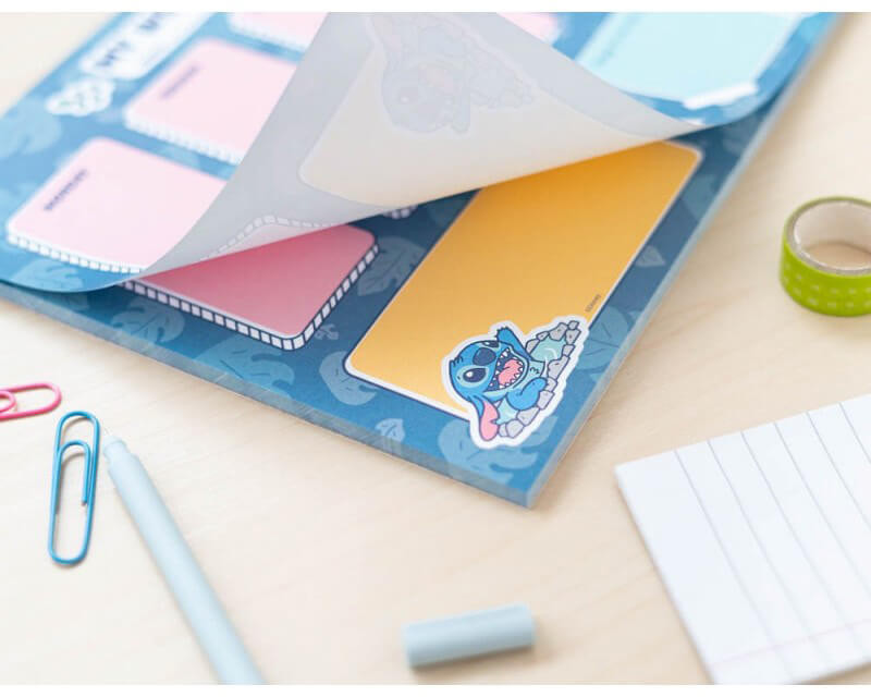 Stitch jegyzettömb, heti tervező tömb, A/4. Praktikus a napi/heti teendők leírásához. Célok, teendők, fontos dolgok. 54 db 90 gr-os papírral. Ragasztott kötés.