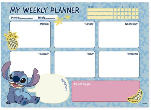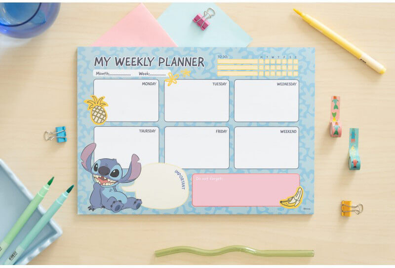Stitch jegyzettömb, heti tervező tömb, A/4, Tropical. Praktikus a napi/heti teendők leírásához. Célok, teendők, fontos dolgok. 54 db 90 gr-os papírral. Ragasztott kötés.