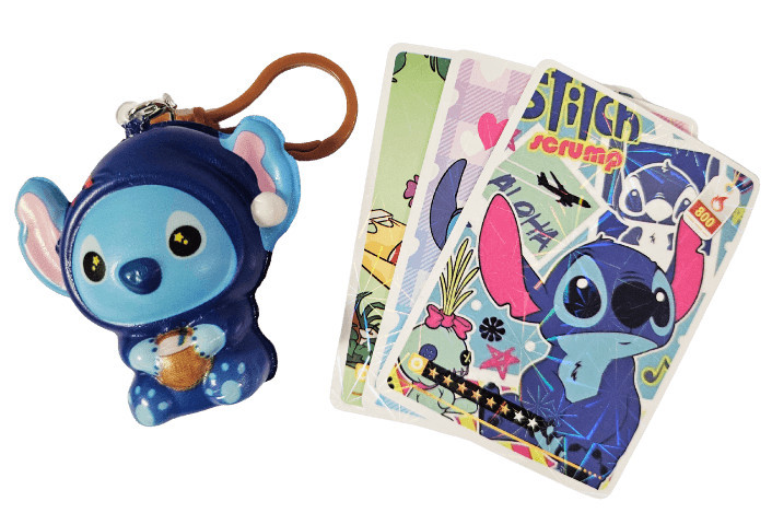 Stitch zsákbamacska stresszlabda, squishy akasztóval és kártyákkal, kb. 5x6cm, tasakban