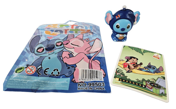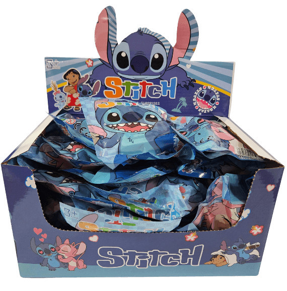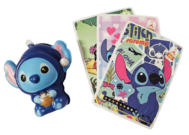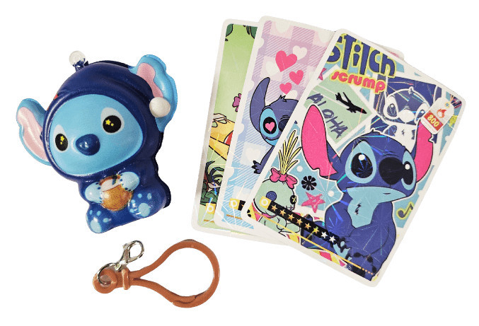 Stitch zsákbamacska stresszlabda, squishy akasztóval és kártyákkal, kb. 5x6cm, tasakban. Az ár egy darabra vonatkozik.