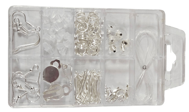 Szerelék ékszerkészítéshez, gyöngyfűzéshez 6x9,5cm-es dobozban