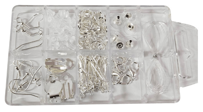 Szerelék ékszerkészítéshez, gyöngyfűzéshez 6x9,5cm-es dobozban Alapkészlet különböző ékszerek készítéséhez, például karkötők, nyakláncok, stb.