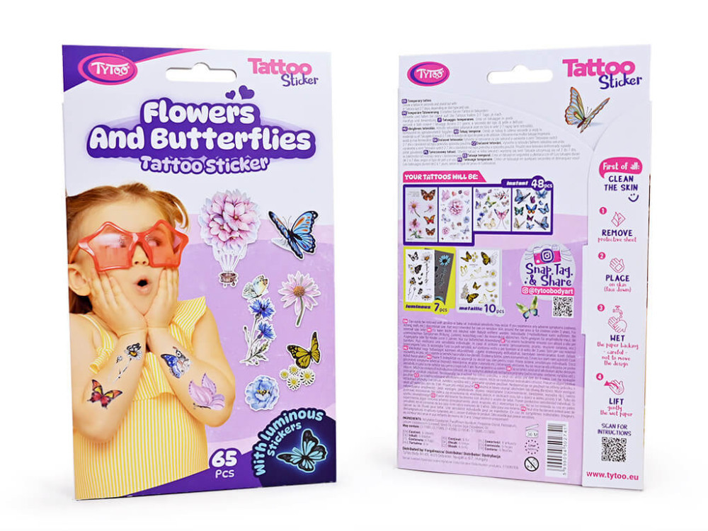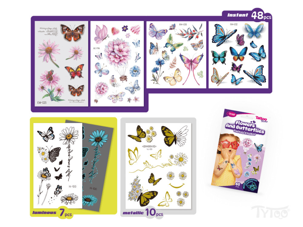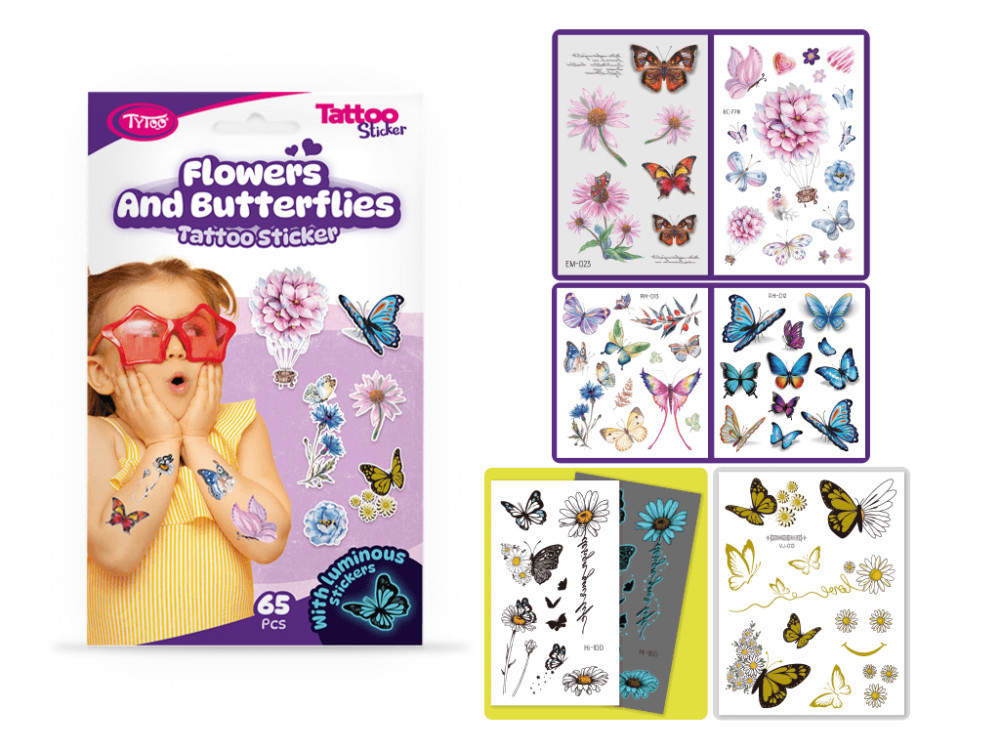A szett tartalma: 65 db Virágos és pillangós matrica tetoválás 6db íven