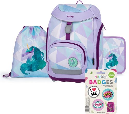 Unikornis ergonómikus hátizsák, iskolatáska tolltartóval és tornazsákkal, OXY Sherpy Unicorn, lila.