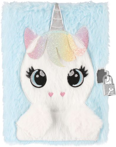 Unikornis napló kulccsal, A/5, plüss borítóval, Unicorn. Napló, emlékkönyv. Vonalas.