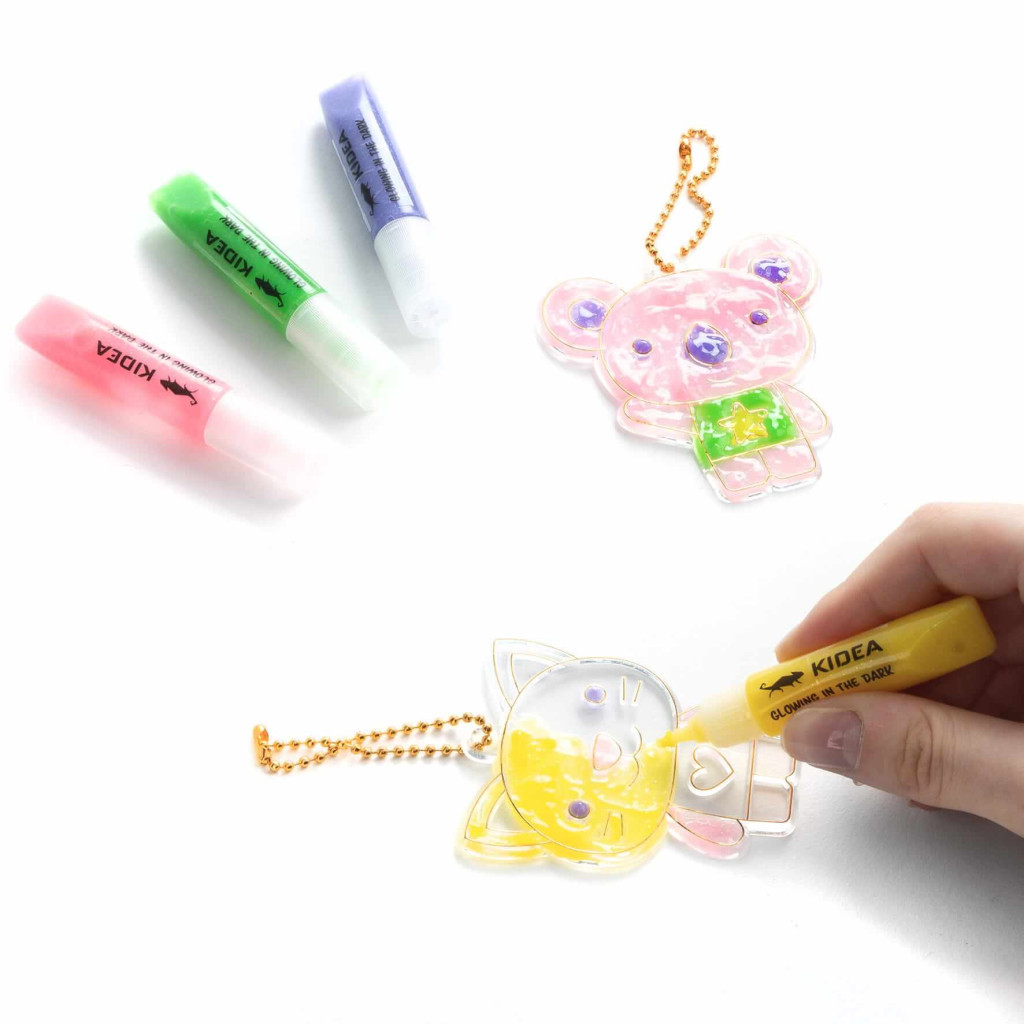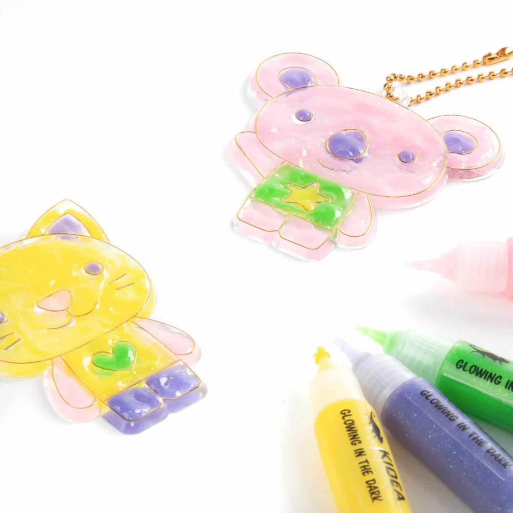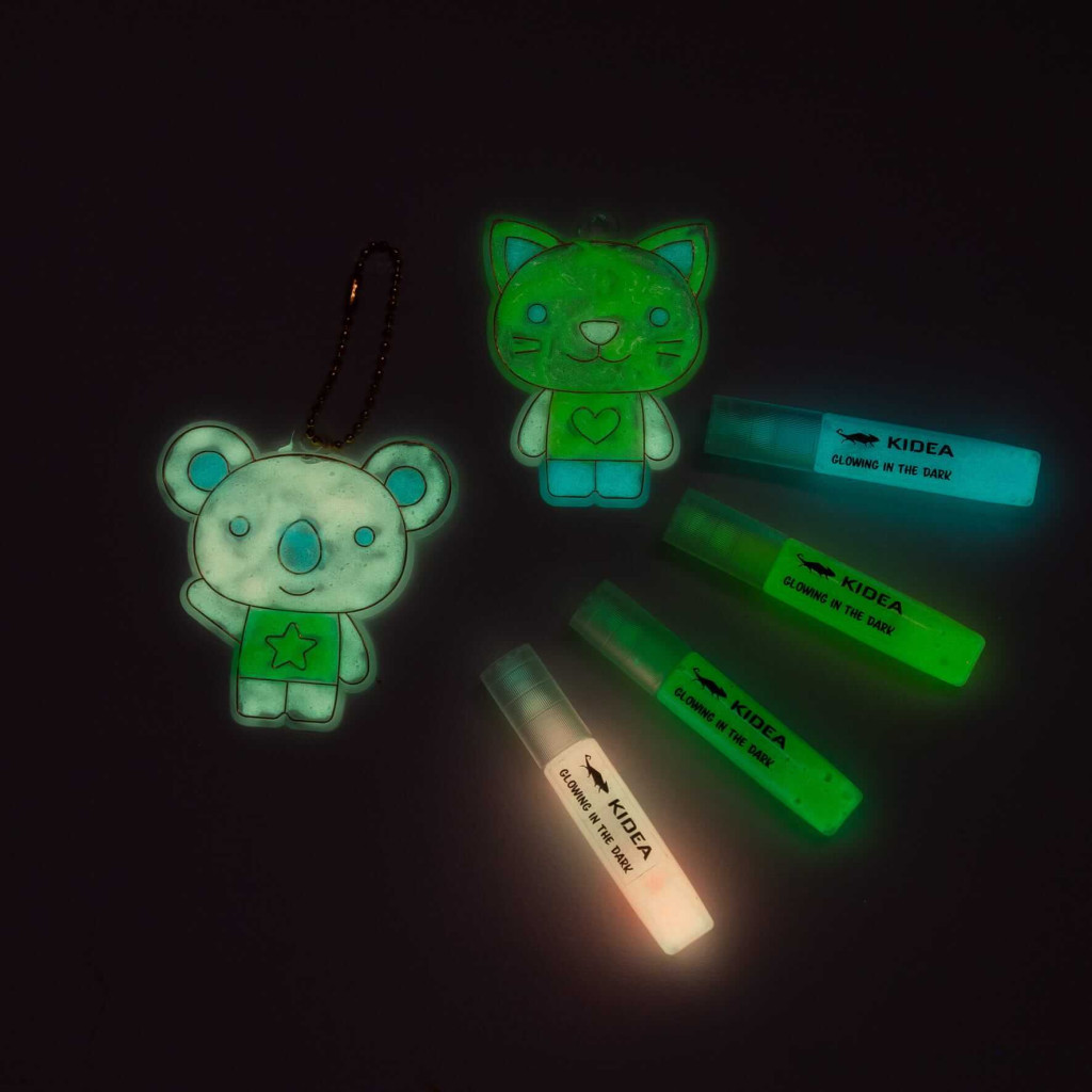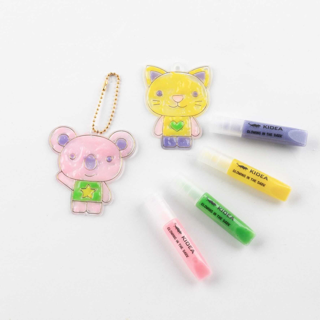Üvegfesték készlet, 4 foszforeszkáló üvegfesték 2 db felakasztható fényvarázs formával, állatos, Kidea A formák kitölthetők a készletben található festékkel. Száradás után a mellékelt lánc segítségével felakasztható hátizsákra, tolltartóra vagy hasznáható medálként is. Csomagolás mérete: 23x20cm