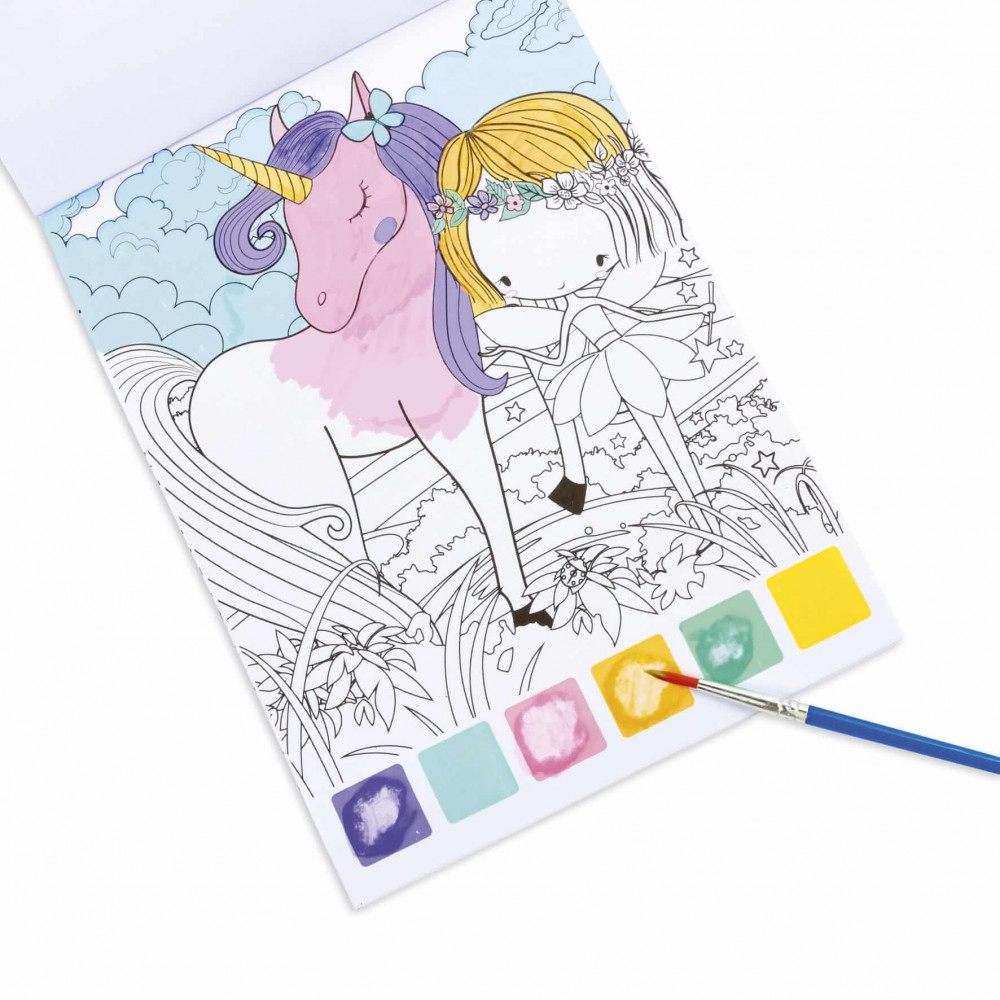 Varázskifestő készlet, 10 lapos, unikornis, Kidea Ez egy különleges festőkészlet a Kidea-tól. A csomag 10 festhető lapot tartalmaz. A színes festékek rajta vannak a lapon. Meg kell nedvesíteni az ecsetet és benedvesíteni a kiválasztott színű festéket és már festhetünk is az adott színnel. Nem kell külön festéket vinni. Méretek: 150 x 210 mm