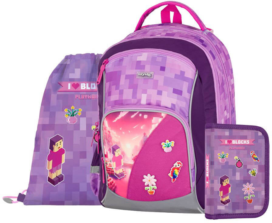 OXY GO iskolatáska szett, hátizsák tolltartóval és tornazsákkal, Minecraft mintás, Playworld Girl, lila-rózsaszín
