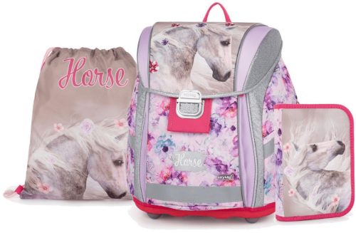 Lovas csatos ergonómikus iskolatáska tolltartóval és tornazsákkal, Premium Light, Horse Romantic, fehér ló