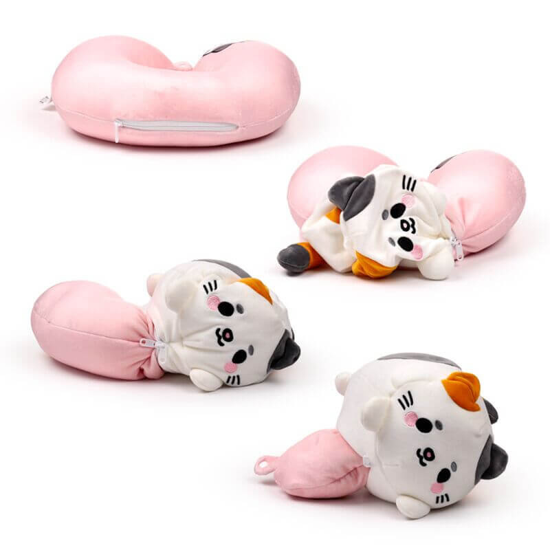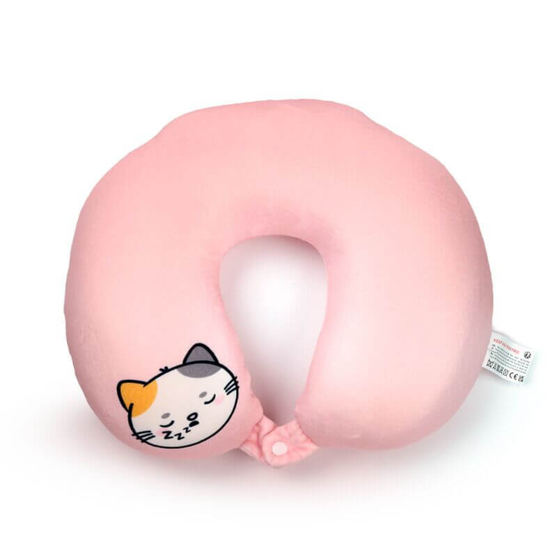 2 az 1-ben kifordítható utazópárna és plüss figura, macska, rózsaszín